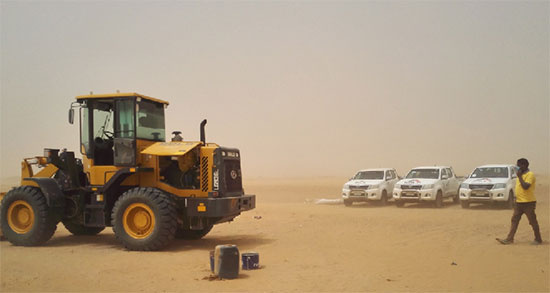 山东澳门广东会网站北非区域的销售及服务团队在沙漠矿区内开展市场走访活动,走访人员在走访阿伯哈莫德市区附近的矿区时,遭遇2018年以来最严重的沙尘暴,能见度不足100米,恶劣的天气挡住了进矿的道路。