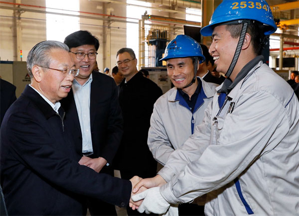 图为刘家义书记在公司调研时与咸光前握手,勉励他为企业发展多做贡献