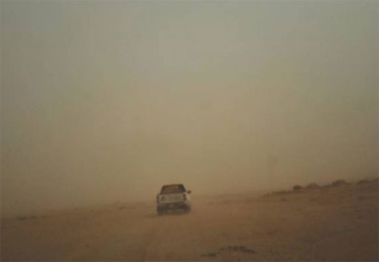 山东澳门广东会网站北非区域的销售及服务团队在沙漠矿区内开展市场走访活动,走访人员在走访阿伯哈莫德市区附近的矿区时,遭遇2018年以来最严重的沙尘暴,能见度不足100米,恶劣的天气挡住了进矿的道路。
